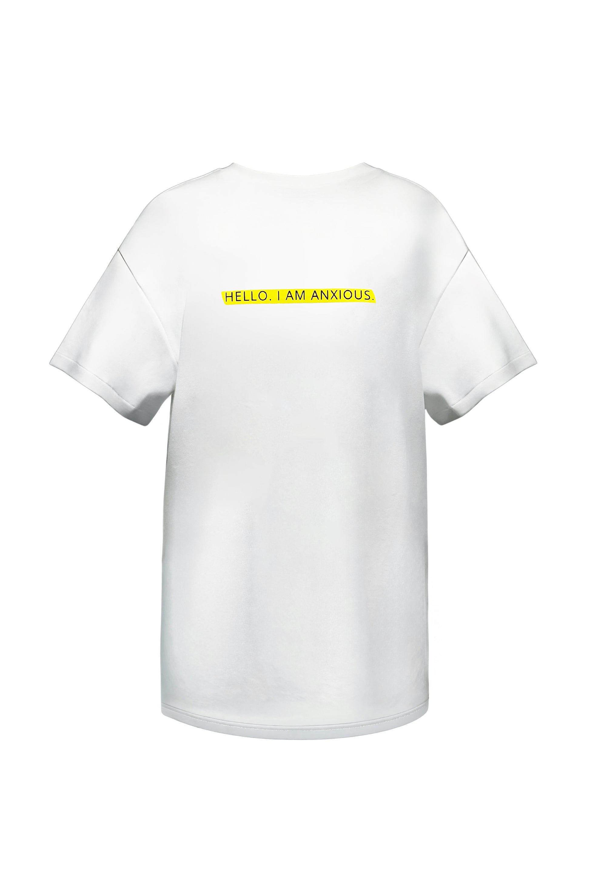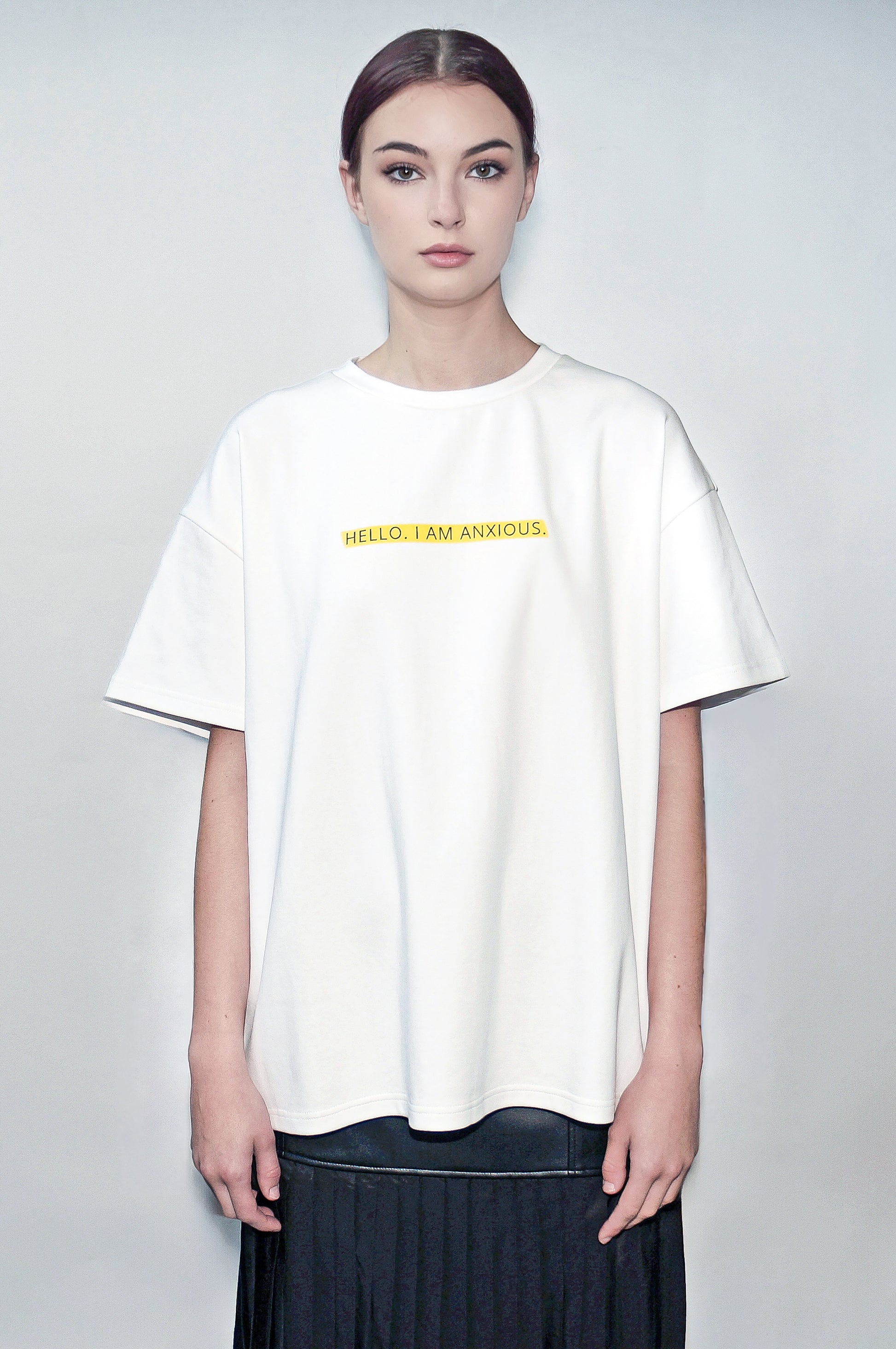 Your t-shirt says it so you don't have to. Made of ultra-soft heavyweight jersey, this tee features a highlighted graphic that reads "Hello. I am anxious." Designed with a structured drape and oversized fit, it balances wit and vulnerability with understated confidence.